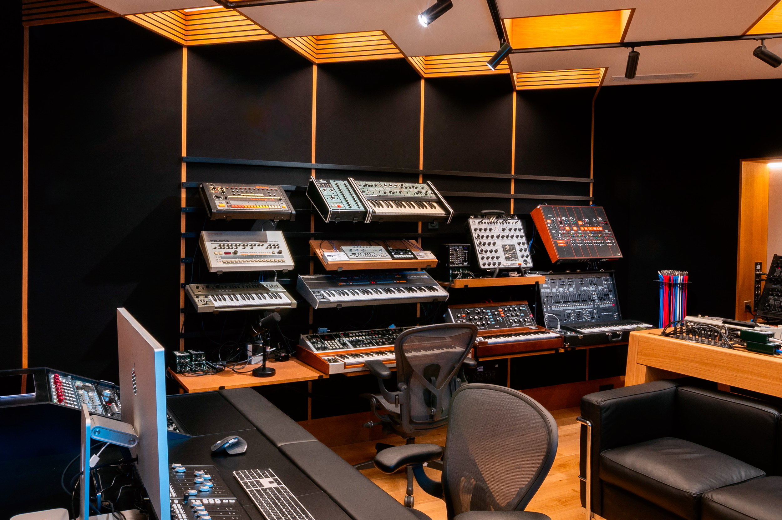 Supports muraux orientables, fixables sur le traitement sonore. Cet ensemble permet d’y installer des synthés, des modulaires, des pédales etc. sans que le traitement acoustique derrière soit obstrué.